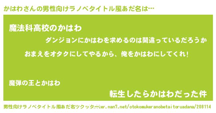 | 女子向けラノベタイトル風あだ名 | 『かはわ夫妻のなれそめ』 |