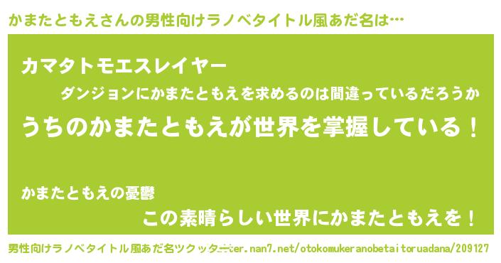 | 女子向けラノベタイトル風あだ名 | 『男装かまたともえの憂鬱な任務』 |