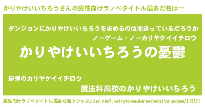 | 女子向けラノベタイトル風あだ名 | 『(仮)かりやけいいちろうのやんごとなき事情』 |