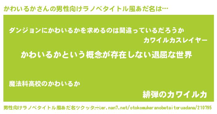 | 女子向けラノベタイトル風あだ名 | 『異世界で失敗しない100のかわいるか』 |