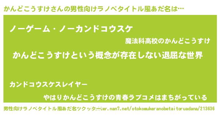 | 女子向けラノベタイトル風あだ名 | 『異世界で失敗しない100のかんどこうすけ』 |