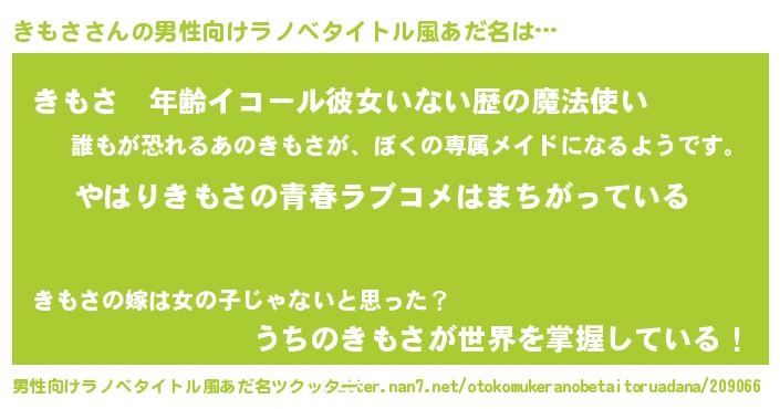 | 女子向けラノベタイトル風あだ名 | 『きもさ伯爵の花嫁』『きもさ様がみてる』 |