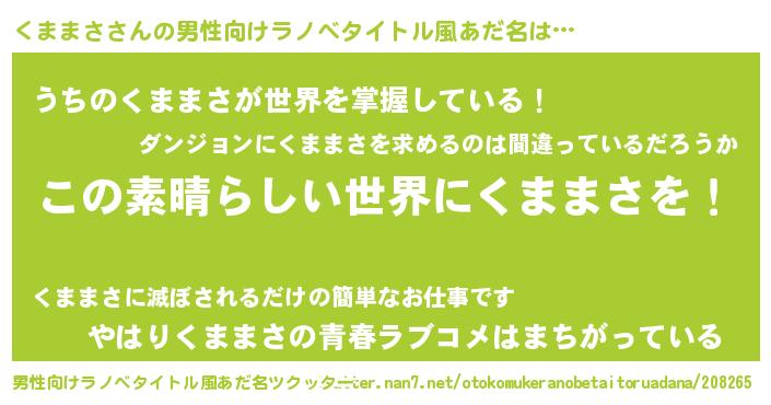 | ヒーロー風カッコイイあだ名 | 『仮面クマダー』『ウルトラくままさマン』 |