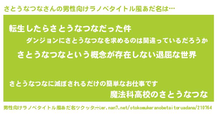 | 女子向けラノベタイトル風あだ名 | 『異世界で失敗しない100のさとうなつな』 |