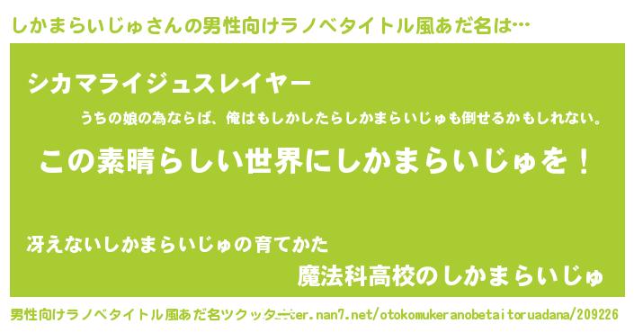 | 意味不明あだ名 | 『住所不定無職しかまらいじゅ(7歳)』 |