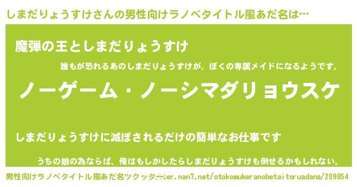 | 女子向けラノベタイトル風あだ名 | 『死神しまだりょうすけの再婚』 |