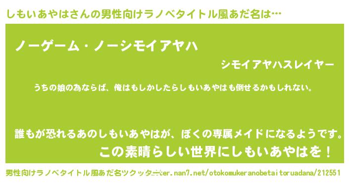 しもいあやはさんの男性向けラノベタイトル風あだ名をツクッター!