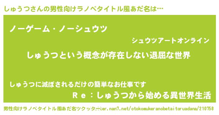 | 胡散臭い通販商品みたいなあだ名 | 『来世でも幸せになれる水素水…その名も「しゅうつ」』 |