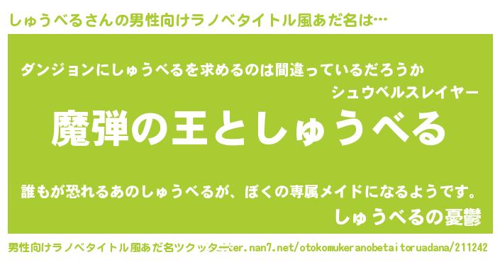 | 女子向けラノベタイトル風あだ名 | 『しゅうべるが死なない童話 林檎のしゅうべるの診療簿』 |