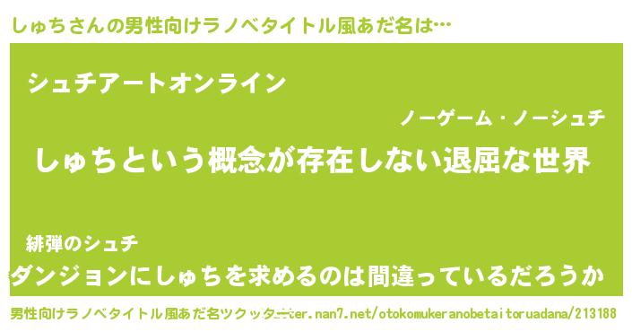 | 女子向けラノベタイトル風あだ名 | 『異世界で失敗しない100のしゅち』 |