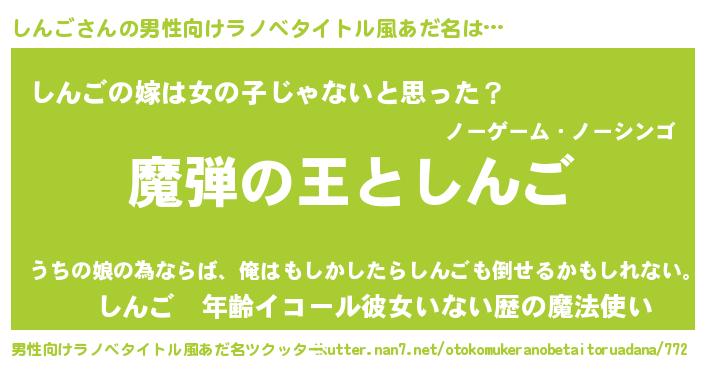 | 女子向けラノベタイトル風あだ名 | 『しんごが死なない童話 林檎のしんごの診療簿』 |