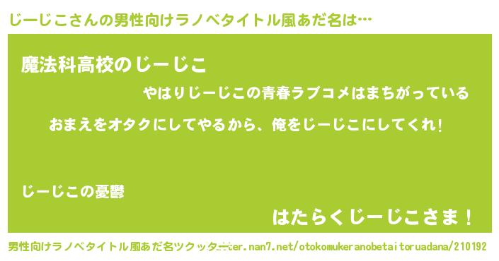| 女子向けラノベタイトル風あだ名 | 『じーじこ夫妻のなれそめ』 |