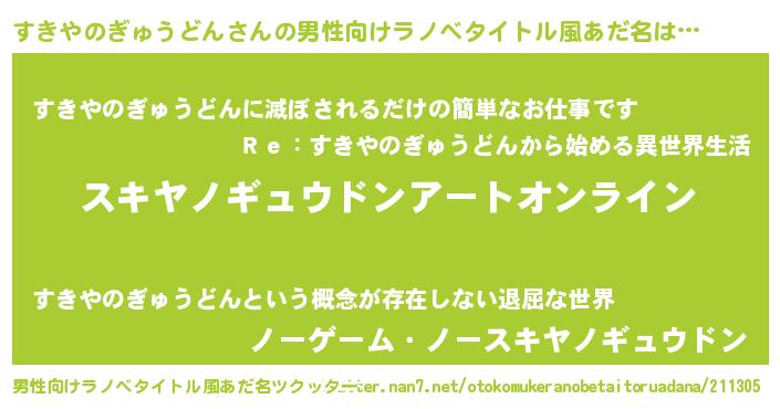 | 胡散臭い通販商品みたいなあだ名 | 『億万長者になれる霊験あらたかなお札…その名も「すきやのぎゅうどん」』 |