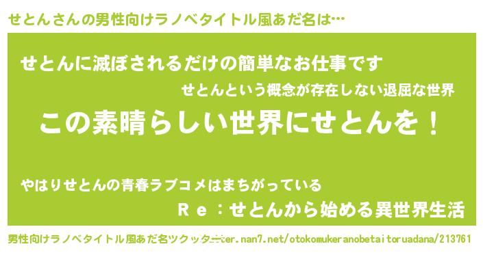 | 女子向けラノベタイトル風あだ名 | 『乙女ゲームの破滅フラグしかない悪役せとんに転生してしまった…』 |