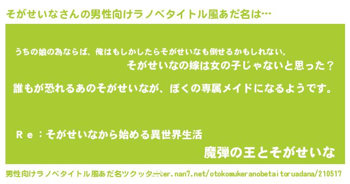 | 女子向けラノベタイトル風あだ名 | 『異世界でカフェそがせいなを開店しました。』 |