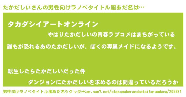 | 胡散臭い通販商品みたいなあだ名 | 『前代未聞の健康食品…その名も「たかだしい」』 |