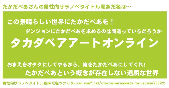 | 女子向けラノベタイトル風あだ名 | 『たかだべあ姫と円卓の騎士』 |