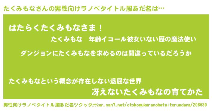 | 女子向けラノベタイトル風あだ名 | 『たくみもなは平凡を望む』 |