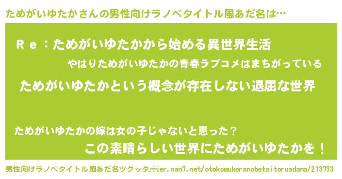 | 胡散臭い通販商品みたいなあだ名 | 『絶対に幸福をもたらす水素水…その名も「ためがいゆたか」』 |