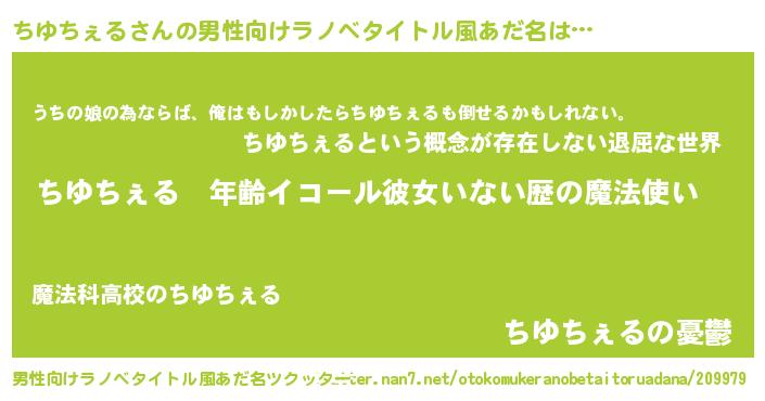| 女子向けラノベタイトル風あだ名 | 『ちゆちぇるの玉の輿計画!』 |