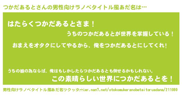 | 女子向けラノベタイトル風あだ名 | 『つかだあると夫妻のなれそめ』 |