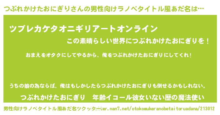 | 女子向けラノベタイトル風あだ名 | 『つぶれかけたおにぎり夫妻のなれそめ』 |