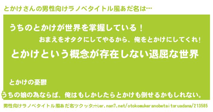 | 胡散臭い通販商品みたいなあだ名 | 『絶対に幸福をもたらす水素水…その名も「とかけ」』 |
