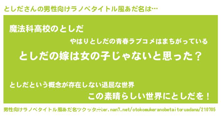 | 女子向けラノベタイトル風あだ名 | 『としだ様がみてる』『としだ伯爵の花嫁』 |