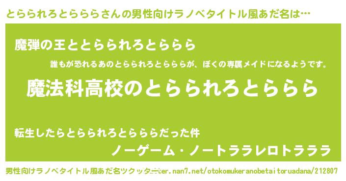 | 女子向けラノベタイトル風あだ名 | 『とらられろとらららなんてお断りですっ。』 |