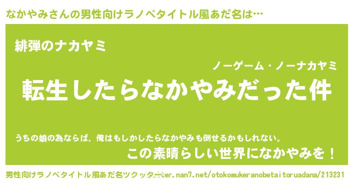 | 女子向けラノベタイトル風あだ名 | 『なかやみの玉の輿計画!』 |