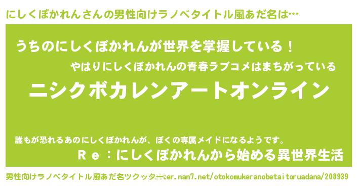 | 女子向けラノベタイトル風あだ名 | 『誰かこのにしくぼかれんを説明してください! ~契約から始まるウェディング~』 |
