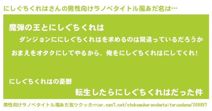 | 女子向けラノベタイトル風あだ名 | 『にしぐちくれは夫妻のなれそめ』 |