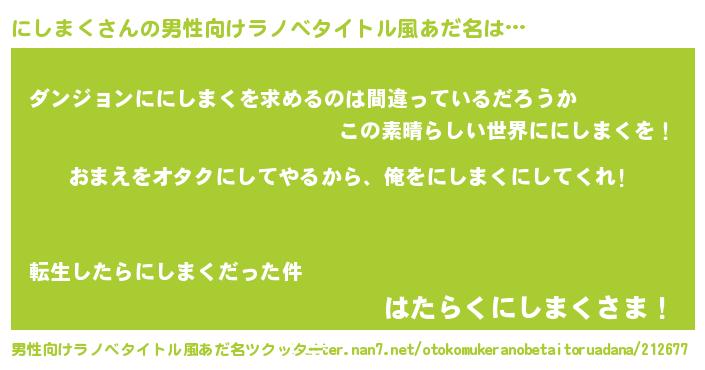 | 女子向けラノベタイトル風あだ名 | 『にしまく夫妻のなれそめ』 |