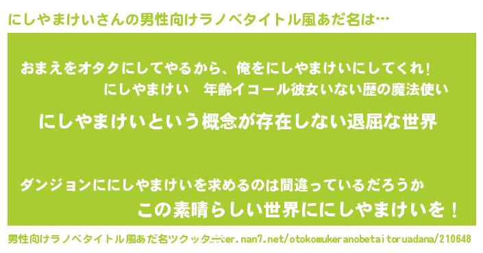 | 女子向けラノベタイトル風あだ名 | 『にしやまけいの契約王妃』 |
