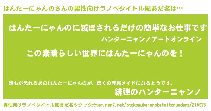 | 女子向けラノベタイトル風あだ名 | 『乙女ゲームの破滅フラグしかない悪役はんたーにゃんのに転生してしまった…』 |