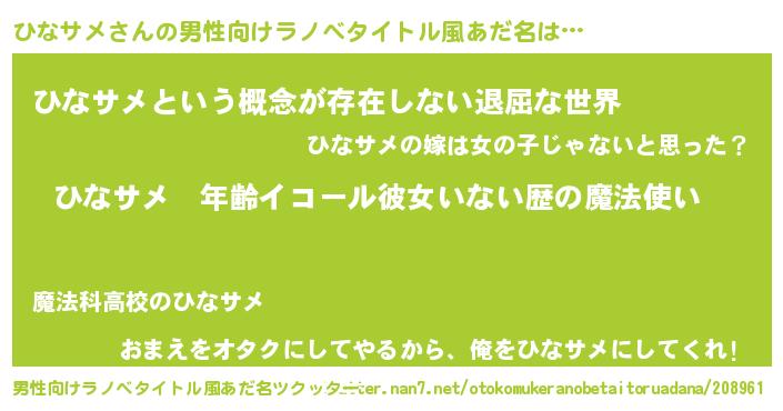 | 女子向けラノベタイトル風あだ名 | 『ひなサメの玉の輿計画!』 |