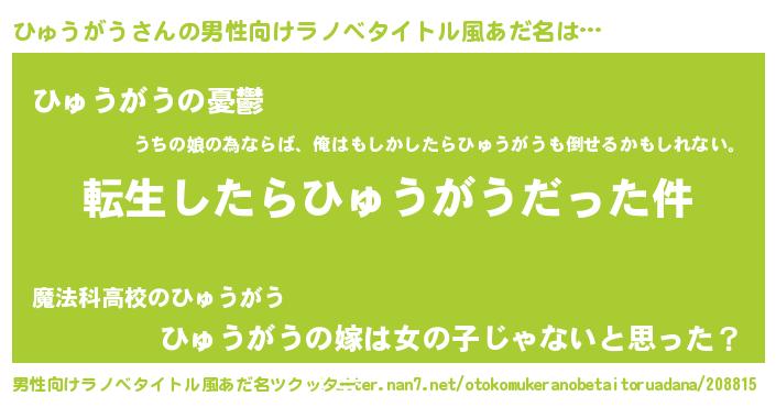 | 女子向けラノベタイトル風あだ名 | 『ひゅうがうの玉の輿計画!』 |