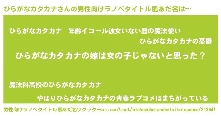 | 女子向けラノベタイトル風あだ名 | 『ひらがなカタカナの卵を拾いまして』 |