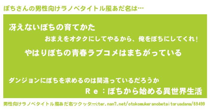 | 女子向けラノベタイトル風あだ名 | 『ぼちの雑貨屋さん』『闇のぼち』 |