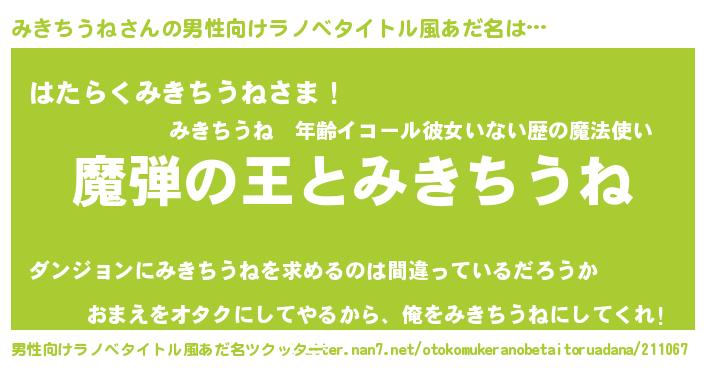 | 女子向けラノベタイトル風あだ名 | 『みきちうねが死なない童話 林檎のみきちうねの診療簿』 |