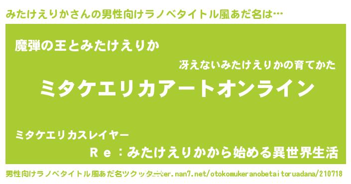 | 女子向けラノベタイトル風あだ名 | 『みたけえりか姫と円卓の騎士』 |