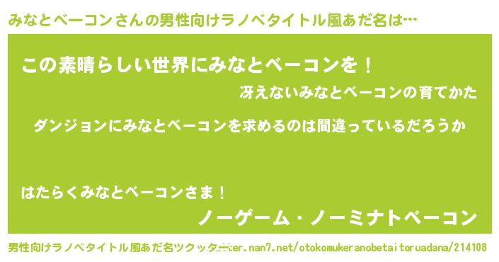 | 女子向けラノベタイトル風あだ名 | 『みなとベーコンの卵を拾いまして』 |