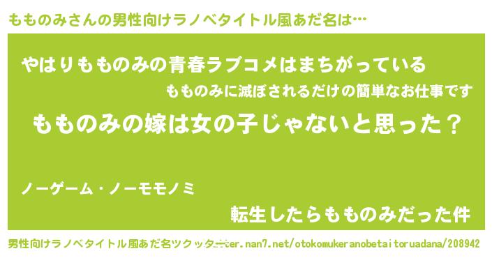 | 女子向けラノベタイトル風あだ名 | 『もものみの卵を拾いまして』 |