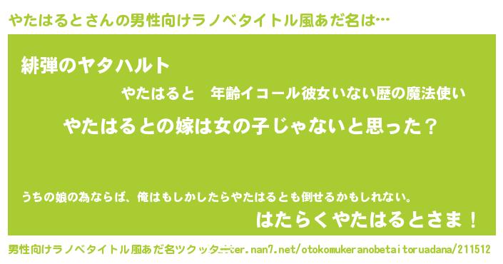 | 女子向けラノベタイトル風あだ名 | 『やたはるとの卵を拾いまして』 |