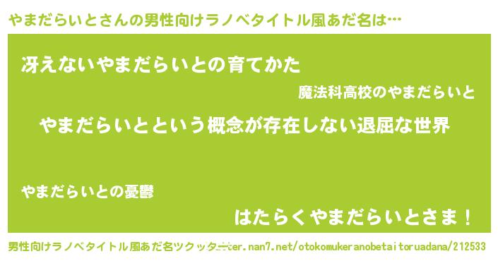 | 胡散臭い通販商品みたいなあだ名 | 『来世でも幸せになれる水素水…その名も「やまだらいと」』 |
