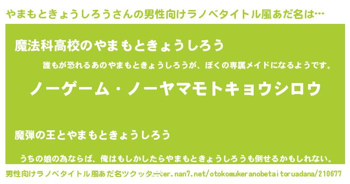 | 女子向けラノベタイトル風あだ名 | 『死神やまもときょうしろうの再婚』 |