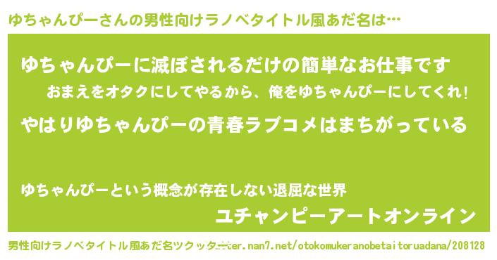 | 女子向けラノベタイトル風あだ名 | 『ゆちゃんぴーの雑貨屋さん』 |