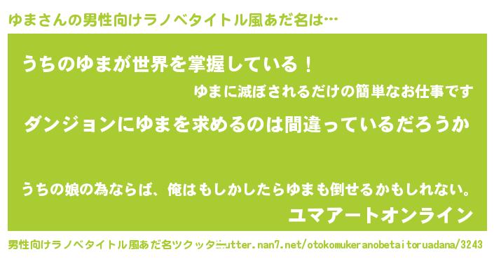 | 女子向けラノベタイトル風あだ名 | 『ゆまは平凡を望む』『ゆまの婚約者』 |