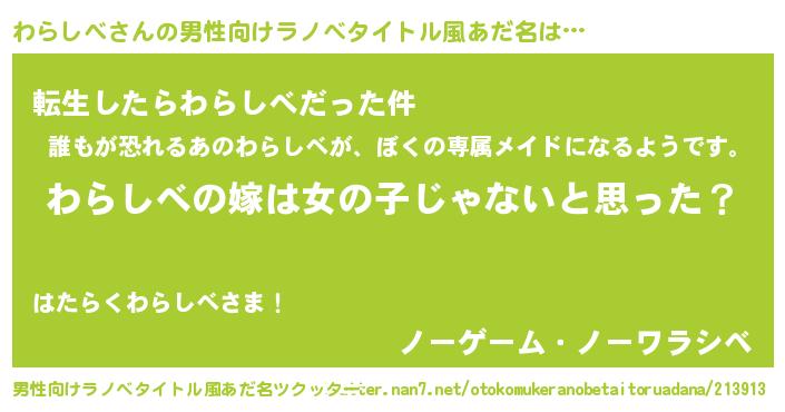 | 女子向けラノベタイトル風あだ名 | 『わらしべの卵を拾いまして』 |
