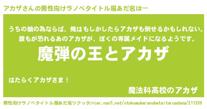 | 意味不明あだ名 | 『住所不定無職アカザ(7歳)』『自称アカザ』 |